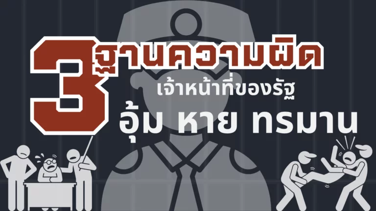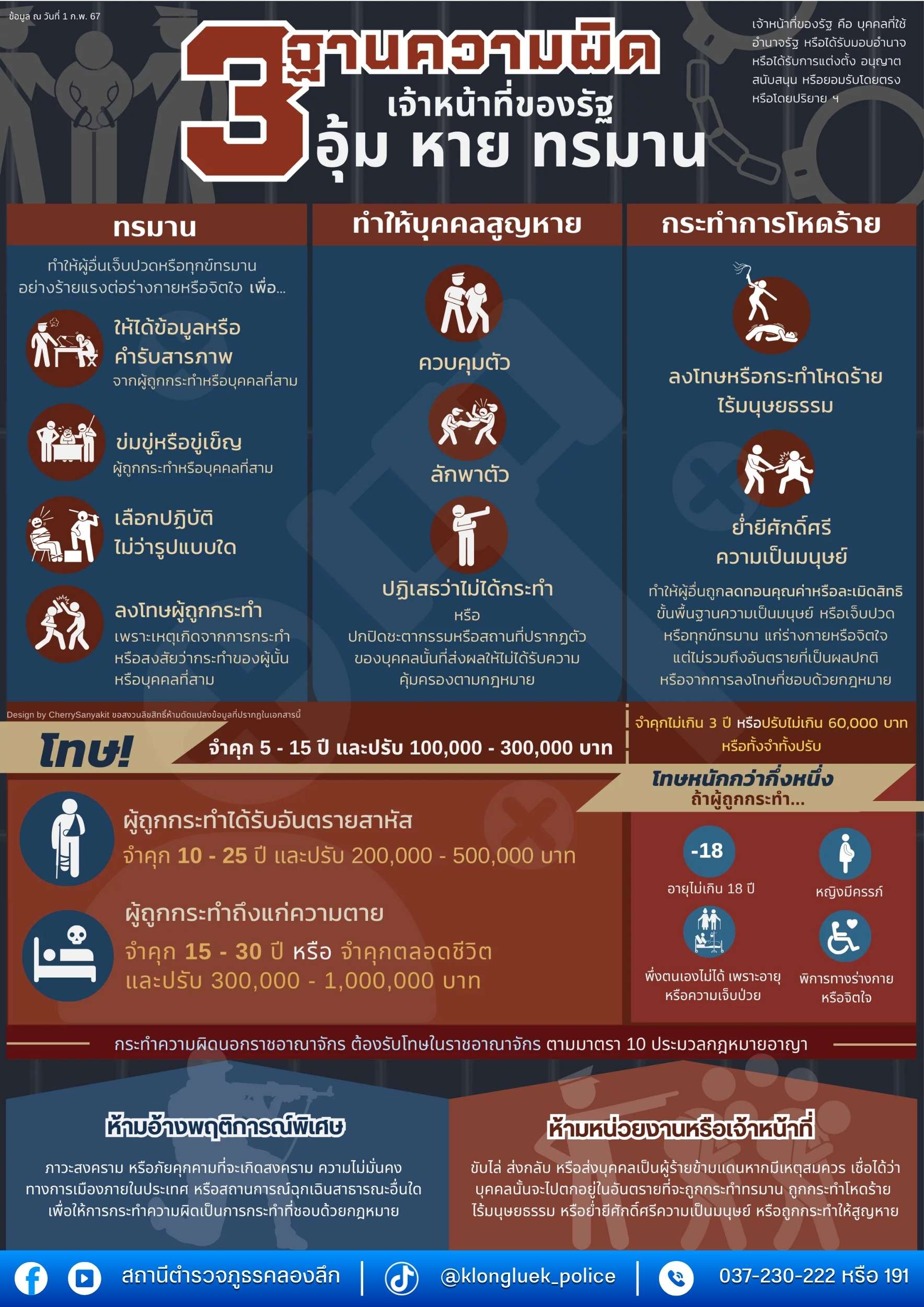 ความผิดฐานกระทำทรมาน : โทษจำคุก 5 – 15 ปี และปรับ 100,000 – 300,000 บาท “ห้ามเจ้าหน้าที่ของรัฐ” กระทำให้ผู้อื่นเกิดความเจ็บปวดหรือความทุกข์ทรมานอย่างร้ายแรงแก่ร่างกายหรือจิตใจ เพื่อวัตถุประสงค์….